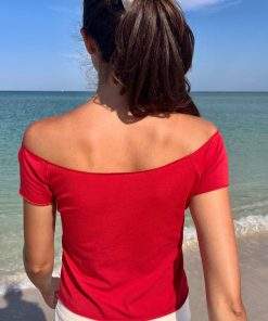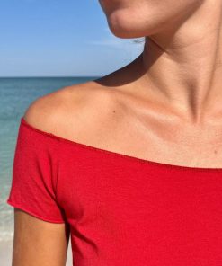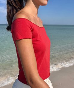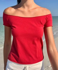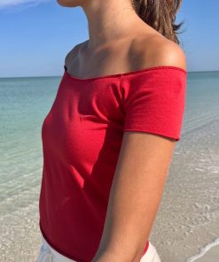 Cotton blend off the shoulder short sleeve crop top with raw hem.Fabrics: 96% cotton, 4% elastaneMeasurement: 21″(53 cm) length, 16″(41 cm) bustMade in: Italy