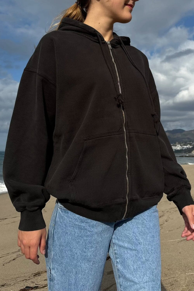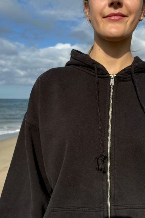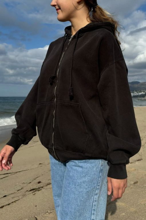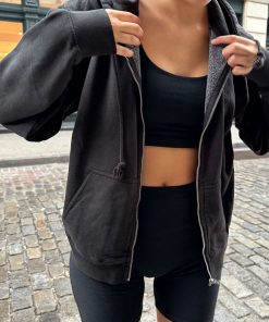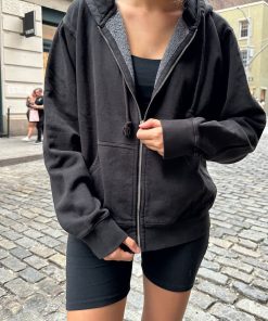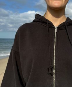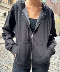 Basic, zip-up hoodie in faded black with two pockets and a drawstring hood. Fabrics: 75% cotton, 25% polyester Measurements: Regular Fit: 23″ (60 cm) length, 20″ (51 cm) bust Oversized Fit: 27″ (74 cm) length, 28″ (71 cm) bust Made In: China