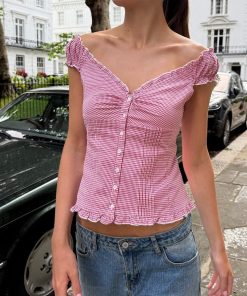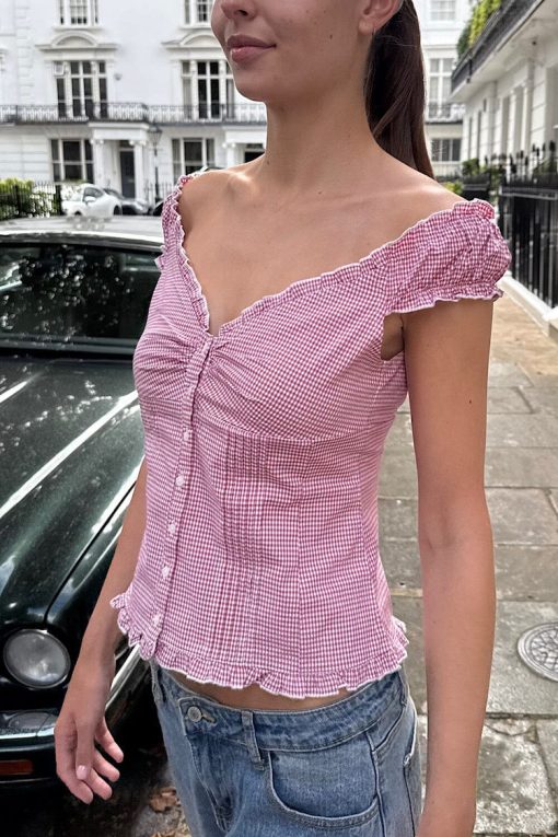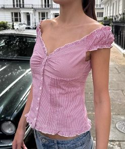 Short sleeve checkered cotton top with ruffle detailing, a seem under the bust, button up.Fabrics: 97% cotton, 3% spandexPink: 100% viscoseMeasurements: 17″ (44 cm) length, 14″ (36 cm) bustMade in: Europe