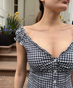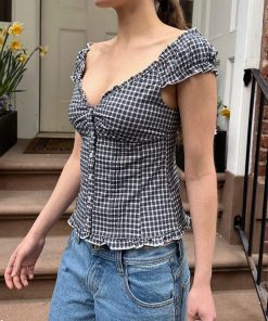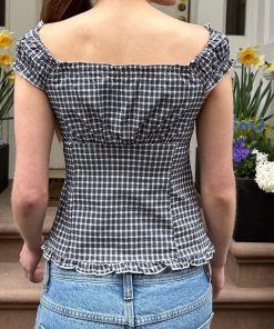 Short sleeve checkered cotton top with ruffle detailing, a seem under the bust, button up.Fabrics: 97% cotton, 3% spandexMeasurements: 17″ (44 cm) length, 14″ (36 cm) bustMade in: Europe