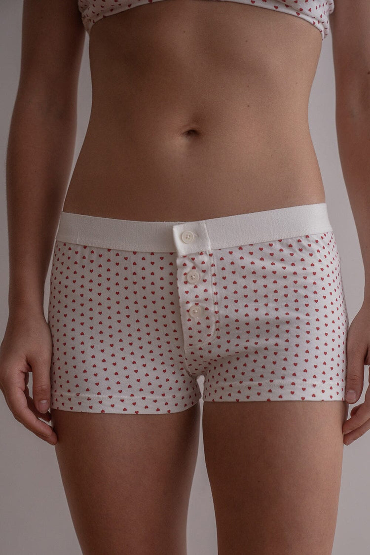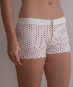 Soft boy short cotton undies with a thick elastic waistband, red hearts print and a button detail. All intimates are final sale.Fabrics: 96% cotton, 4% elastaneMeasurement: 9.5″ (24 cm) rise, 26″ (66 cm) waist (stretches)Made in: Europe