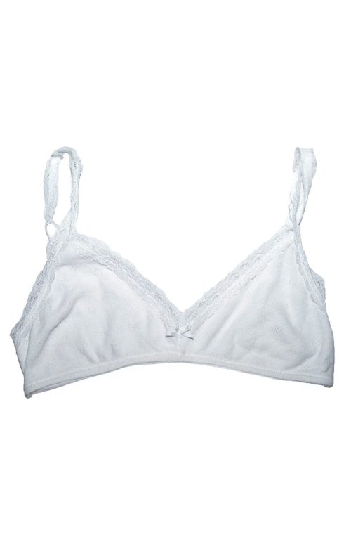 White heart eyelet bra with lace, bow, adjustable straps. Back hook-and-eye closures.All intimates are final sale.Fabrics: 100% cottonMeasurements: 12″ (31 cm) length, 13″ (33 cm) bust Made in: Europe