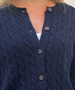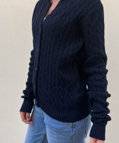 Classic, button-up, cardigan in a wool-blend, cable knit with ribbed trim. Fabrics: 80% lamb wool, 20% nylon Measurements: 18″ (46 cm) length, 17″ (43 cm) bust Made in: Italy