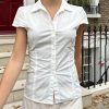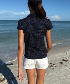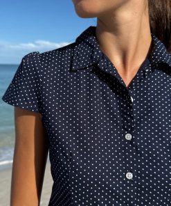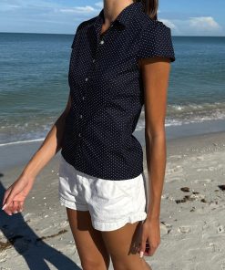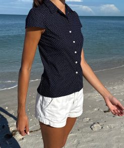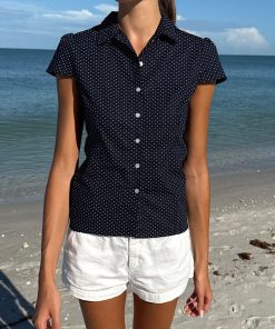 Faded navy blue cotton shirt with white polka dots, collar, buttons, short sleeves, slim fit.Fabrics: 95% cotton, 5% spandexMeasurements: 23″ (58cm) length, 16″ (41cm) bustMade in: China