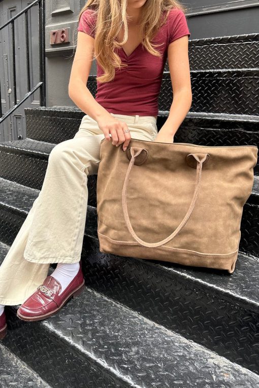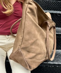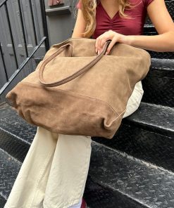 Extra large faux brown suede tote bag with real leather detailing and straps, zip closure, gold hardware, and brown cotton liningAll accessories are final sale.Fabrics: Shell: 65% Polyurethane 35% Full Leather, Lining: 100% cottonMeasurements: 26″ (66cm) length, 21″ (53cm) widthMade in: China